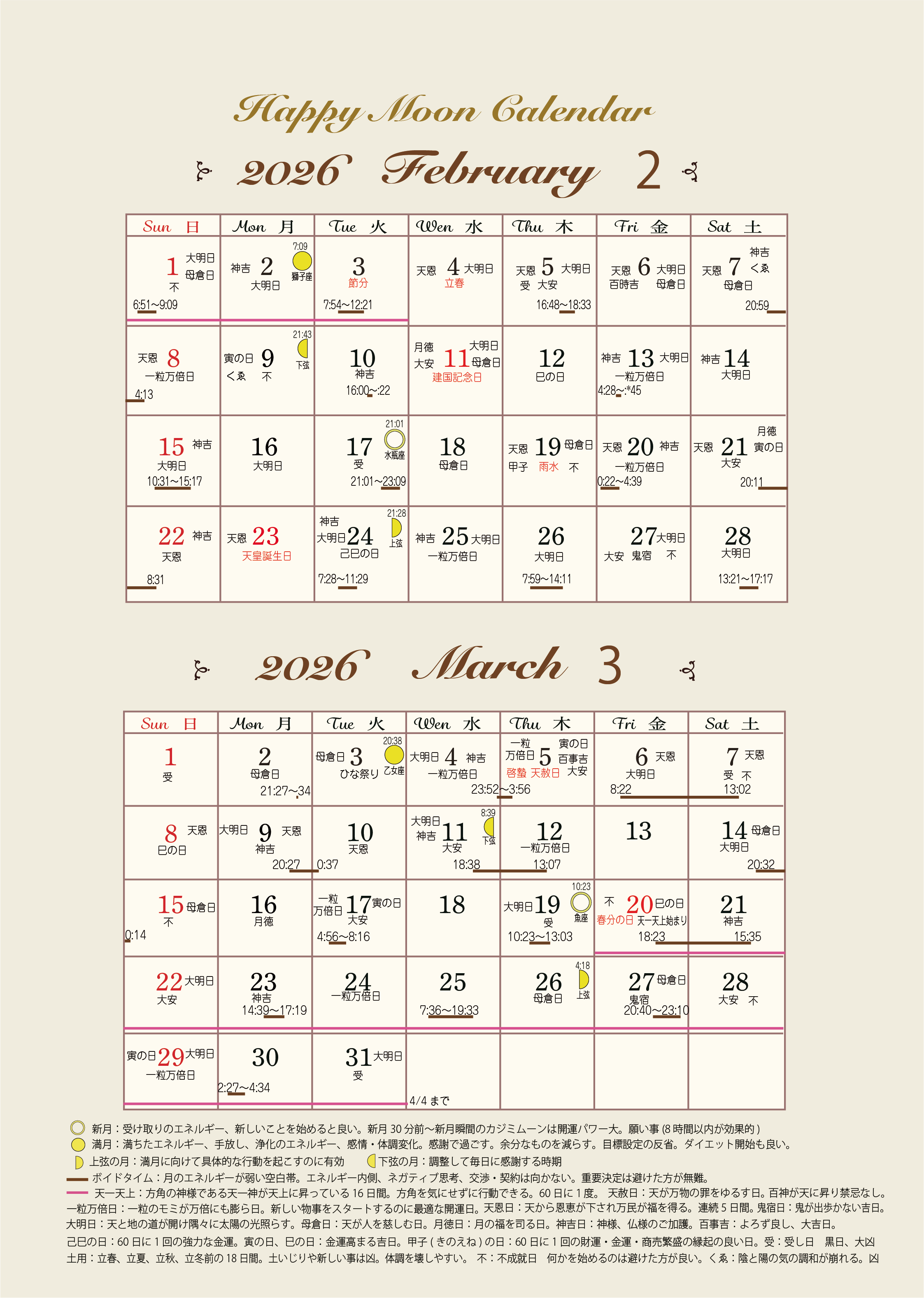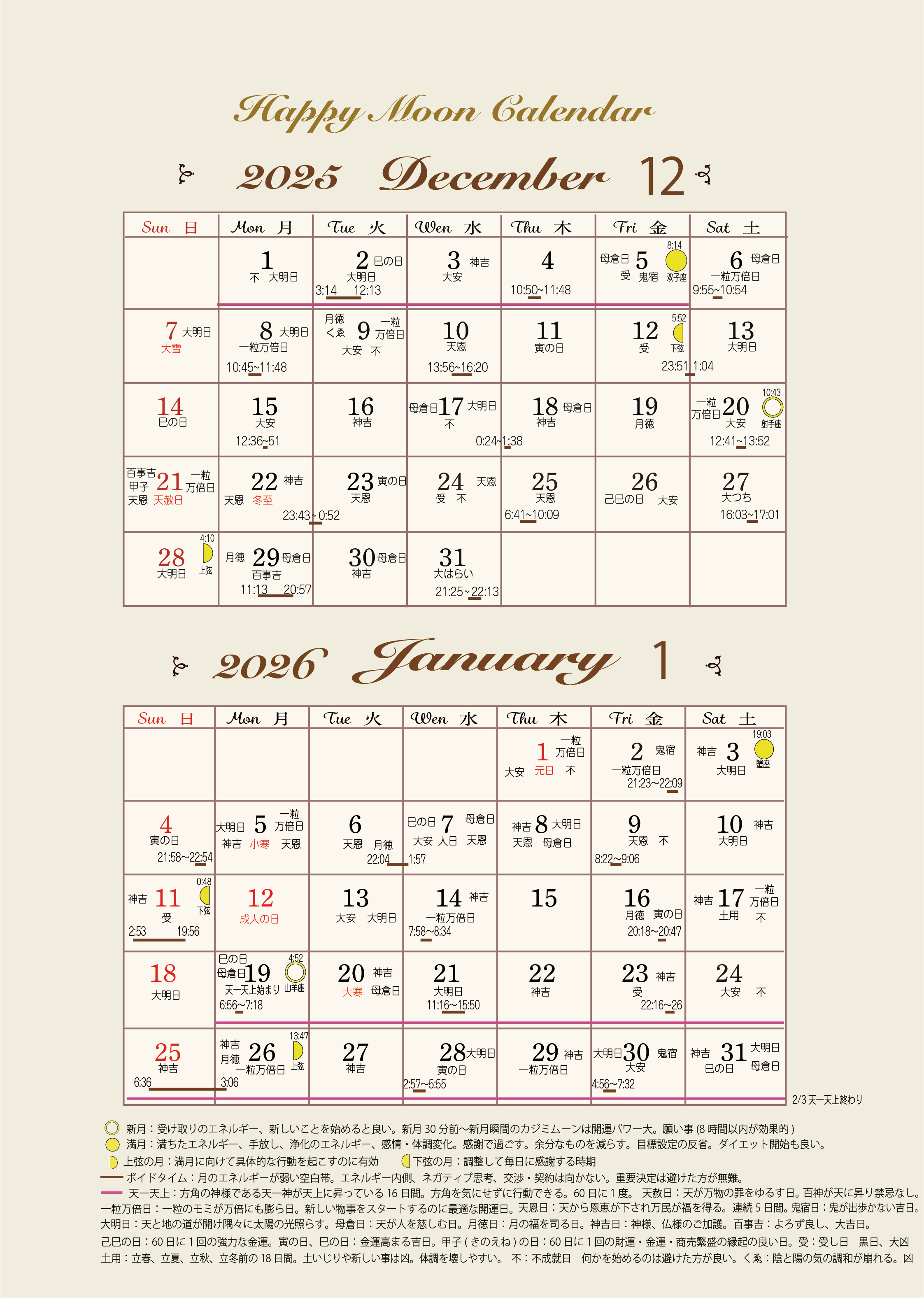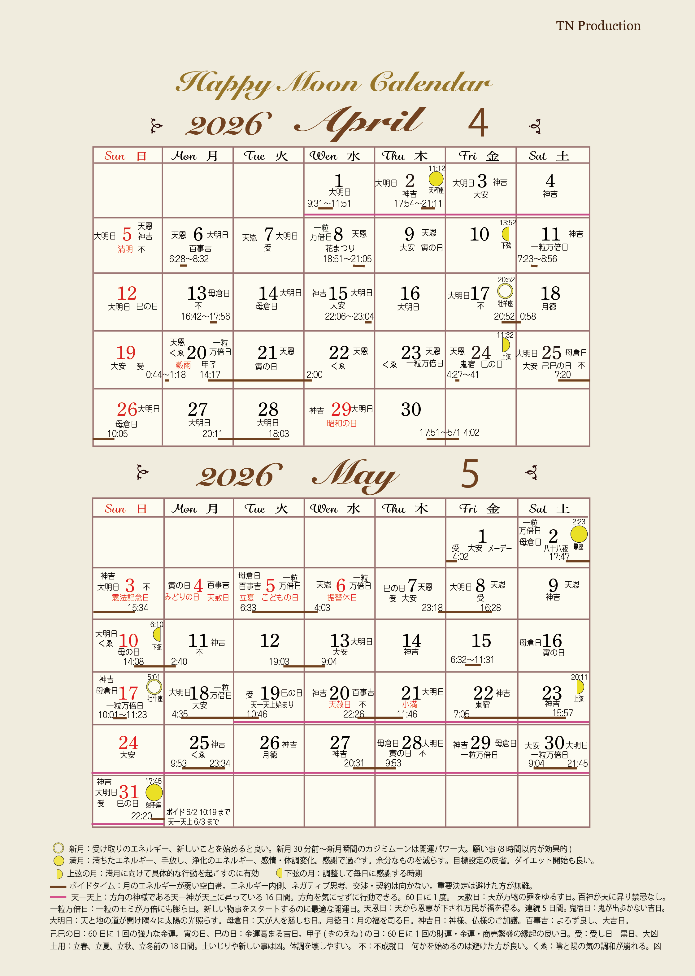 いつの時代でも、 世界のどこにいても、 同じ空を見てきました。 大昔から、 太陽、月の満ち欠け、星の動き、 天空の動きを通して 自分の進むべき方向を感じてきたと言われています。 ボイドタイムとは、 星座が次に移る前の空白地帯です。 ボイド=voidとは「何もない、無効の」 といった意味を持つ言葉です。 ボイドタイムは月の力が発揮されにくかったり、 月の力が無効になると考えられています。 ボイドタイムでは思い通りに進まないケースも多々あり、 重大決定を避ける方もいらっしゃいます。 幸カレンダーでは、 月のボイドタイムに、開運日、凶日を加えてみました。 TNプロダクションでは、2ヶ月分のカレンダーを作成しています。 毎月1日にアップします。 ご興味がありましたら、参考になさってください。 皆様のご多幸を心からお祈りします。 ![]() |